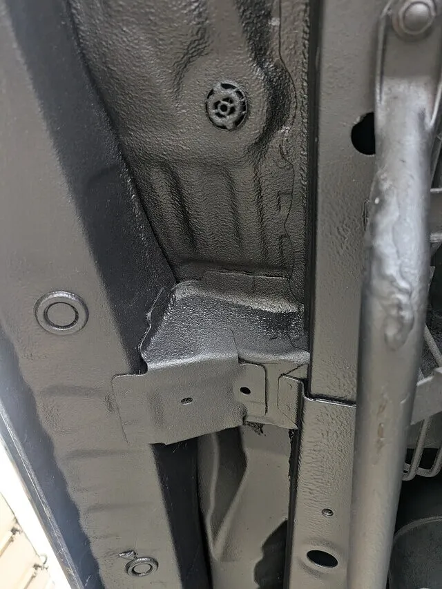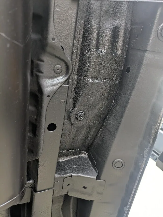 お車の下側(フレーム)には無数の穴が開いています。軽量化や衝突時の衝撃緩和などの役目をしています。